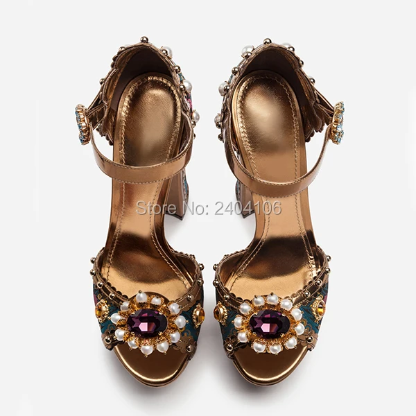Роскошная Летняя обувь из жаккардовой ткани в стиле ретро; Босоножки с разноцветными стразами, жемчужинами и заклепками; Сандалии с ремешком на щиколотке на платформе и блочном каблуке