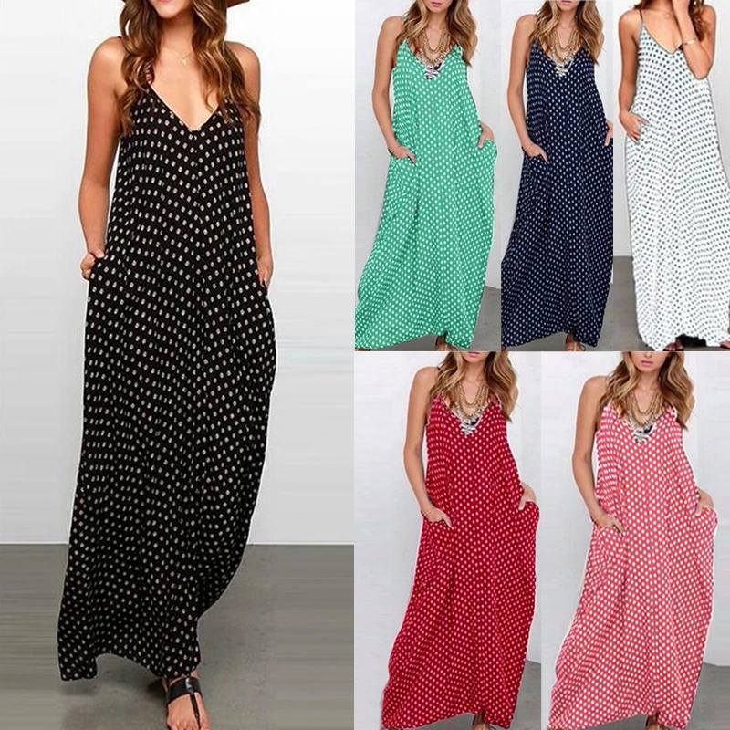 * Описание товара: Летнее женское повседневное свободное платье макси в горошек на тонких бретельках с v-образным вырезом; пляжное платье; Сарафан