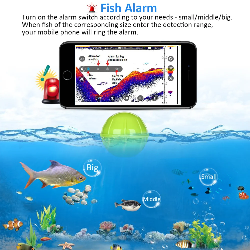 Включите переключатель сигнализации в соответствии с вашими потребностями, маленький, средний, большой. Когда рыба соответствующего размера входит в диапазон обнаружения, ваш мобильный телефон свяжется с сигнализацией