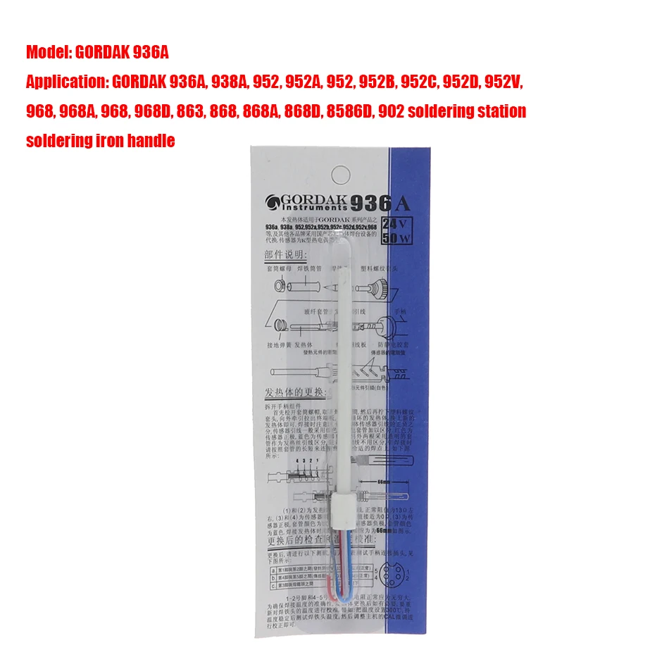Описание продукта: Бренд продукта: GORDAK 936A Название продукта: паяльник Электрическая мощность: 50 Вт Область применения: 936A обогреватель доступен для GORDAK 936A, 938A, 952, 952A, 952, 952B, 952C, 952D, 952V, 968, 968A, 968, 968D, 863, 868, 868A, 868D, 8586D, 902 ручки паяльной станции, а также подходит для других брендов ручек паяльника. Замените нагревательный элемент (рекомендуется профессионалом-специалистом).