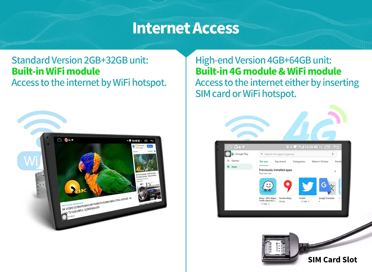 Онлайн развлечения-вы можете наслаждаться сетью 4G, вставив sim-карту на радио. Примечание: 1) 2 + 32 ГБ версия поддерживает только WiFi. 2) Поддержка точки доступа. 3) не поддерживает телефонные звонки. 4) как работает sim-карта 4G на нашем блоке? Пожалуйста, нажмите на картинку ниже или скопируйте эту ссылку на видео YouTube, чтобы узнать больше. 4G SIM: //youtu.be/EqejsERe-V8 5) Поддержка sim-карт ниже: GSM850 gsm: GSM850/EGSM900/DCS1800/PCS1900 WCDMA: BAND1/BAND2/BAND5/BAND8 TD-SCDMA: BAND34/BAND39 TDD-LTE: BAND34/BAND38/BAND39/BAND40/BAND41 FDD-LTE: BAND1/BAND2/BAND3/BAND5/BAND7/BAND8/BAND20/BAND29A
