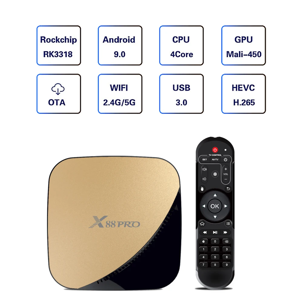 1 x ТВ-приставка X88 Pro 1 х адаптер (5 В 2 а) 1 x ИК-пульт дистанционного управления 1 х HDMI кабель 1 x Руководство пользователя