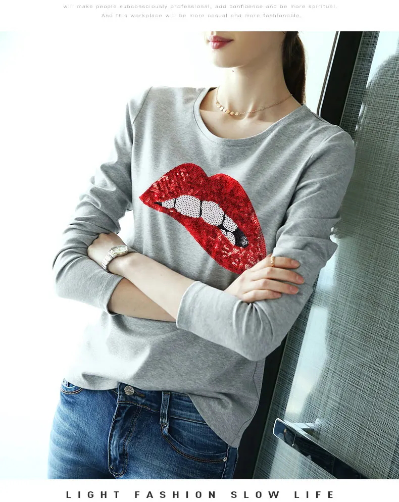 Новинка 2021, модные женские футболки с блестками и губами, туника с длинным рукавом, базовые Топы, футболка, Повседневная Хлопковая женская футболка размера плюс S ~ 5XL | ||