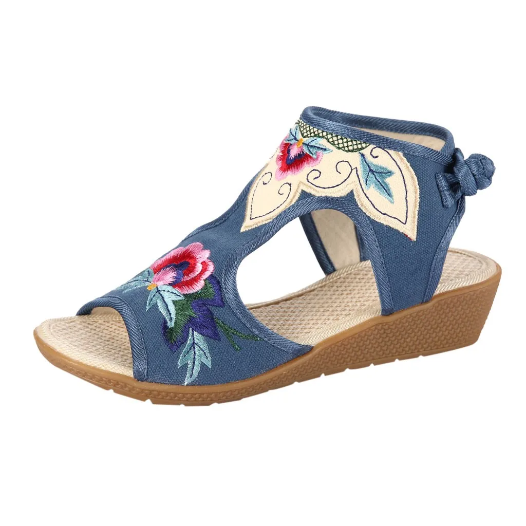 Женские босоножки; Туфли на танкетке с открытым носком в стиле ретро; туфли с вышивкой в национальном стиле