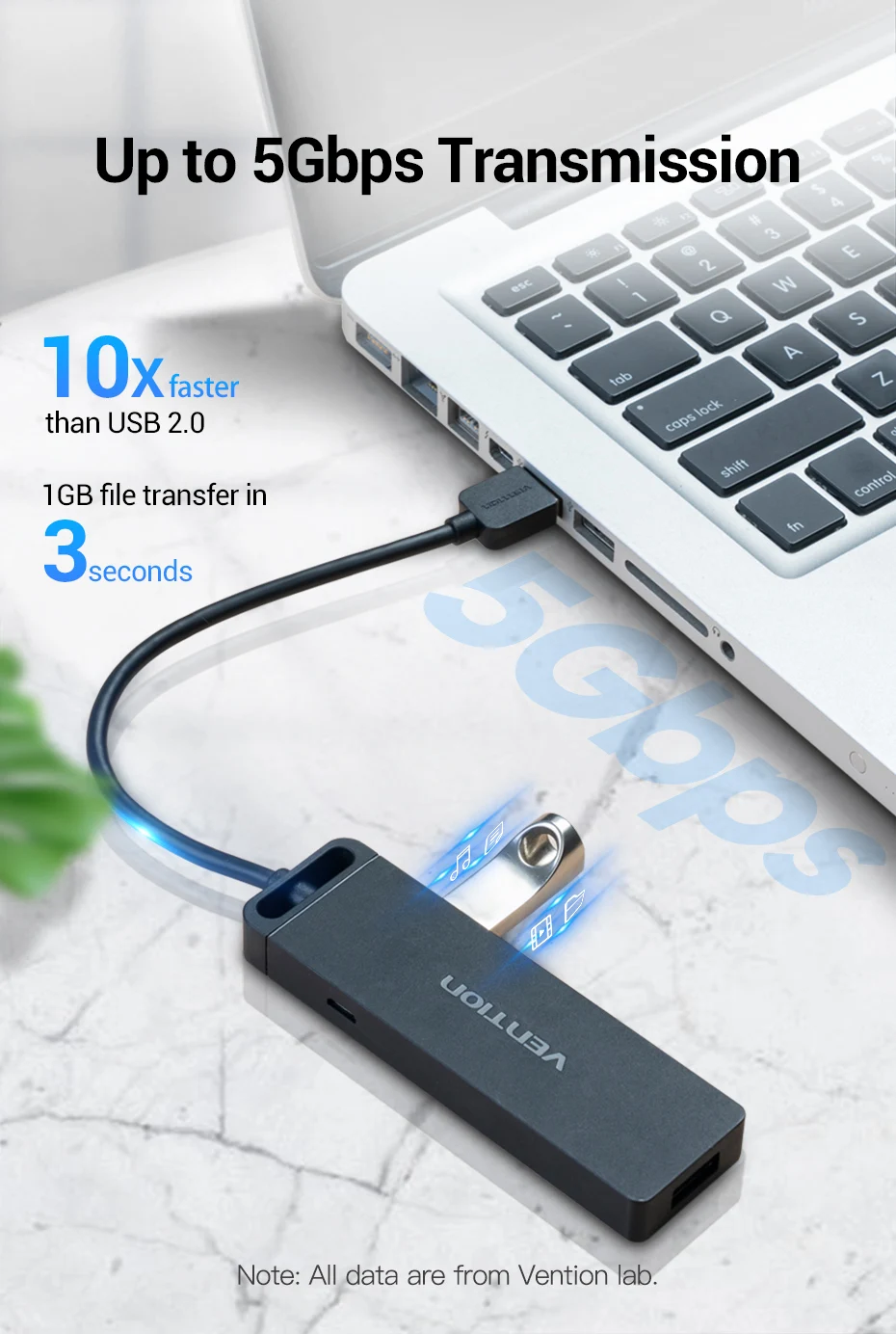 VENTION 4-портовый USB 3,0 концентратор поддерживает супер-быстрая скорость передачи данных до 5 Гбит/с-10X быстрее, чем USB 2,0, который позволяет передавать HD фильмы или массивные файлы за считанные секунды.