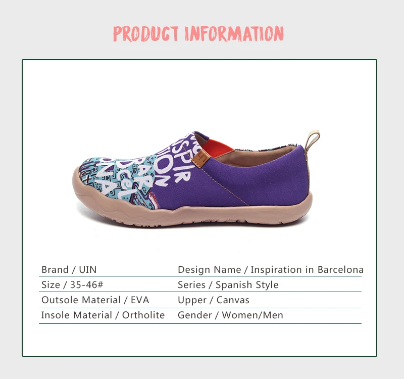 UIN-новейший оригинальный дизайн обуви. Мы настаиваем на простейшем стиле обуви, и большинство творчество и мода дизайн. Мы выбираем живопись, чтобы описать нашу идею на обуви, жизнь-это искусство-наша основная концепция. Надеюсь, мы сможем найти красоту мира вместе с UIN! Обувь UIN имеет привлекательный дизайн, произведенный художниками в Испании. Туфли выглядят так, как будто они были окрашены с помощью кисти художника и имеют разные цвета, что позволяет им легко согласовать все в вашем гардеробе. Окрашенная обувь UIN-это настоящий шедевр обуви, который позволит вам выглядеть шикарно и чувствовать себя комфортно, куда бы вы ни отправились.