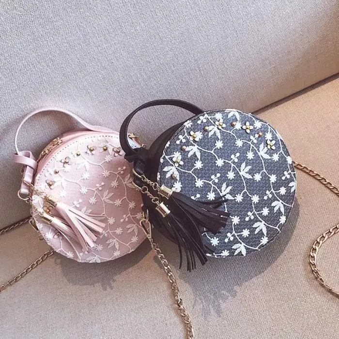 Поверхность покрыта слоем кружева и украшена кисточками, что делает сумку элегантной.