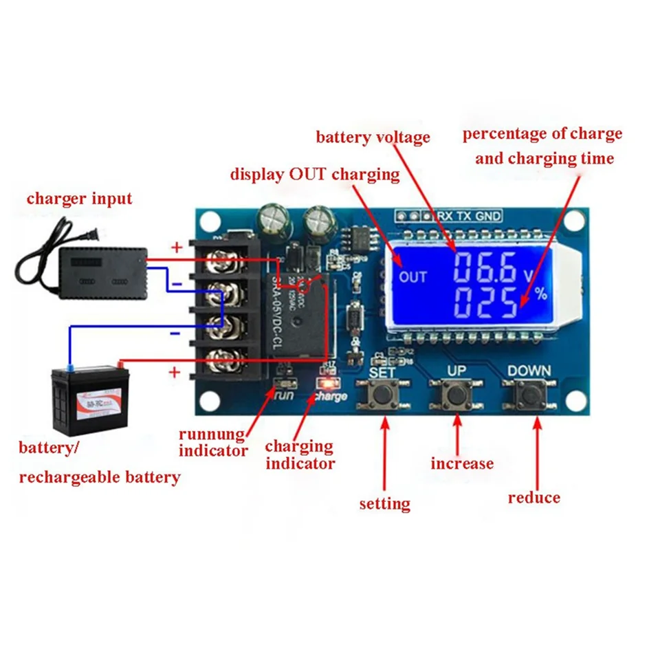 Основные характеристики модуля: Установив volt-HI: 'UP' volt-LI: 'dn'; когда напряжение батареи ниже Вольт-LI: 'dn', реле приводит, зарядное устройство начинает заряжать аккумулятор; когда напряжение батареи до Вольт-привет: «вверх», реле diconnected и автоматическая зарядка завершена один раз; 2.Функция контроля времени зарядки: Как включить функцию контроля времени? После ввода набора параметров установите параметр op без нуля, затем включите функцию контроля времени, параметр op по умолчанию: -- h, по умолчанию не включается функция контроля времени; После открытия функции контроля времени (ОПНе равен нулю), когда напряжение батареи ниже-LI'Dn', Зарядное устройство начало заряжать аккумулятор, система начала работать с часами; во время синхронизации напряжение батареи ≥ Вольт-привет'Вверх', Отключение реле; еслиОПВремя вверх, напряжение батареи по-прежнему ниже Вольт-LI'Dn', Реле держит проводимость, автоматически закрывает функцию контроля времени зарядки и мигаетH: ERЧтобы напомнить пользователю, настройка параметров времени является необоснованной; нажмите любую клавишу, чтобы остановить мигание; Примечание: Формат времени: 00:59 (00 часов, 59 минут) Максимальное время-99: 59, что составляет 100 часов. 3.Функция загрузки серийных данных и настройки параметров: Система поддерживает загрузку данных UART и настройку параметров UART: 115200,8, 1 Cmd Func На Реле позволяют открывать Скидка Реле отключено для открытия Старт Запуск загрузки данных Стоп Остановка загрузки данных Чтение Прочитайте настройки param Dw10.0 Набор Вольт-ли: 'dn' Up20.0 Набор Вольт-привет: "вверх" Xx: xx Установите время зарядки OP 00:00 время остановки зарядки Описание функции