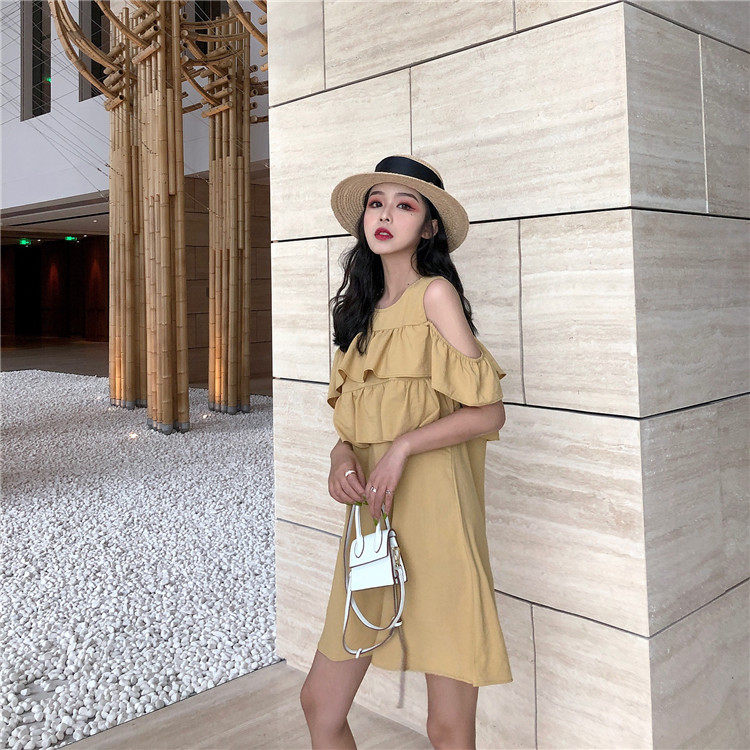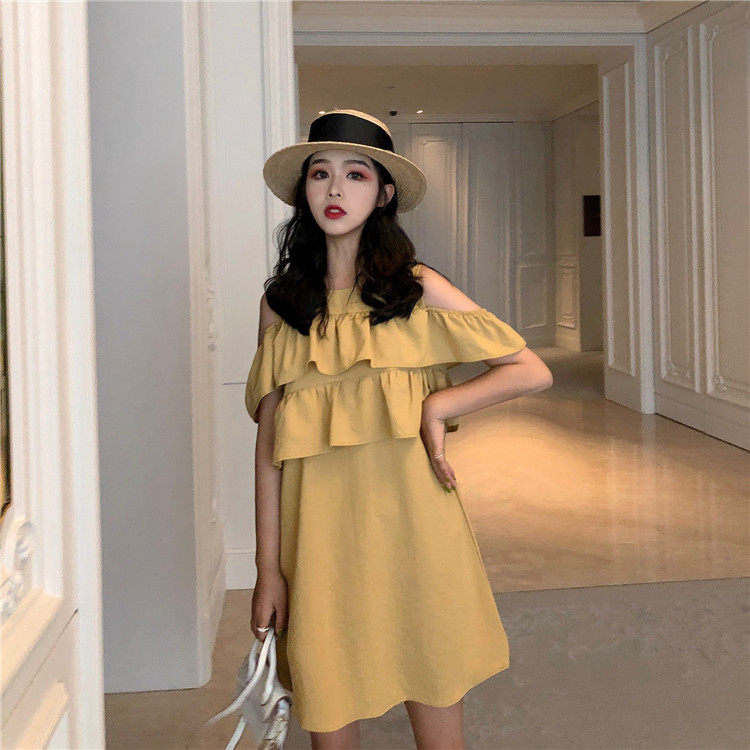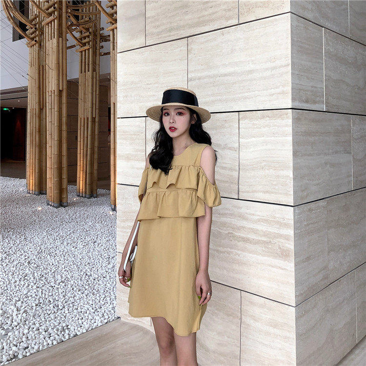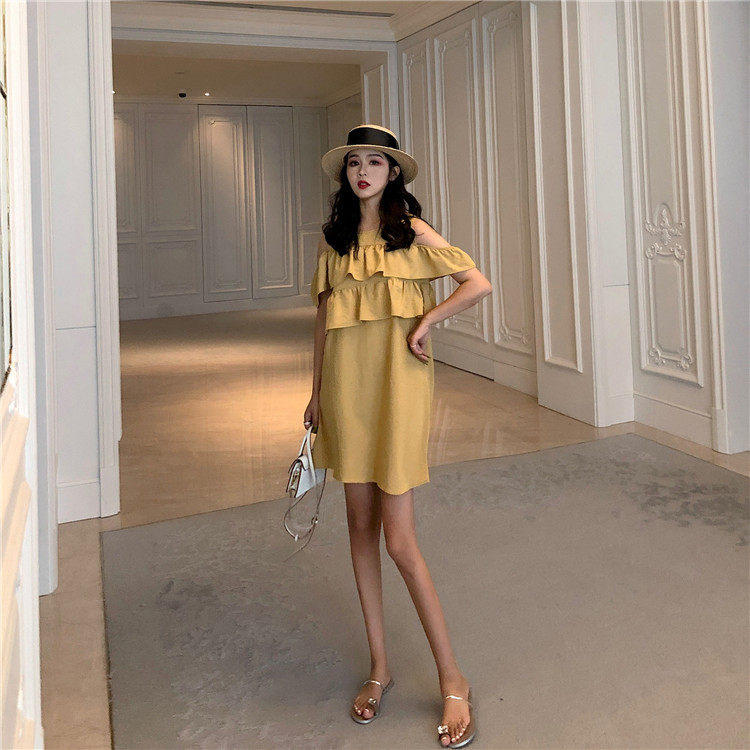 Летнее платье 2019 французский стиль сплошной цвет со складками, с открытыми плечами желтый мини-платье женское