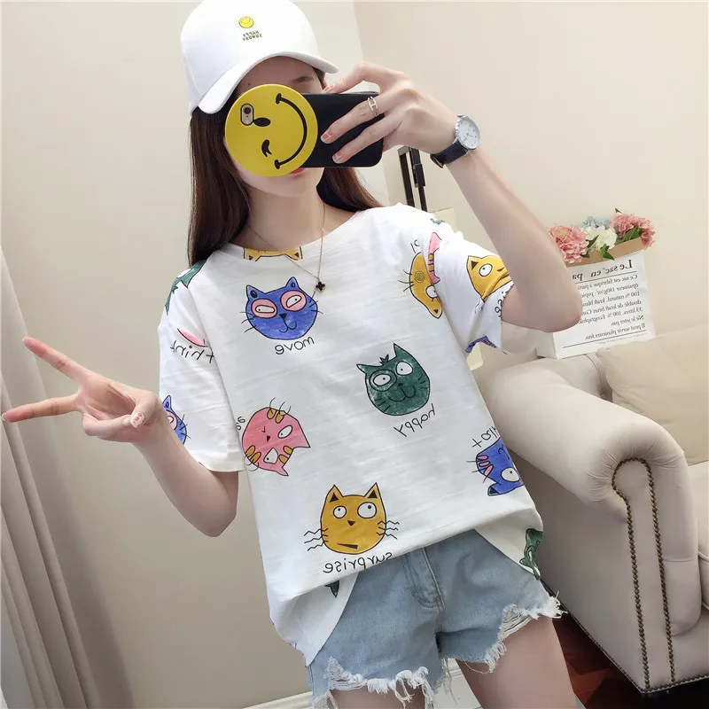 2019 летняя новая женская футболка свободная с круглым вырезом и принтом котенка