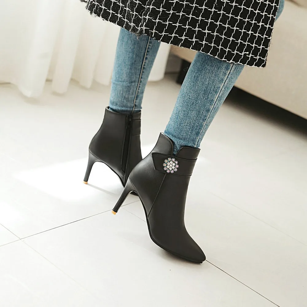 Пикантная обувь с острым носком; женские ботильоны на шпильке со стразами и боковой молнией