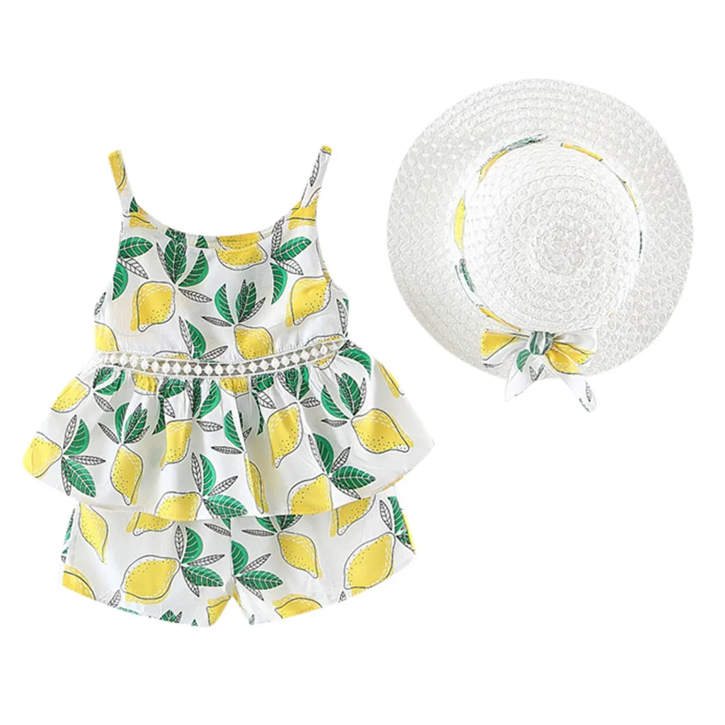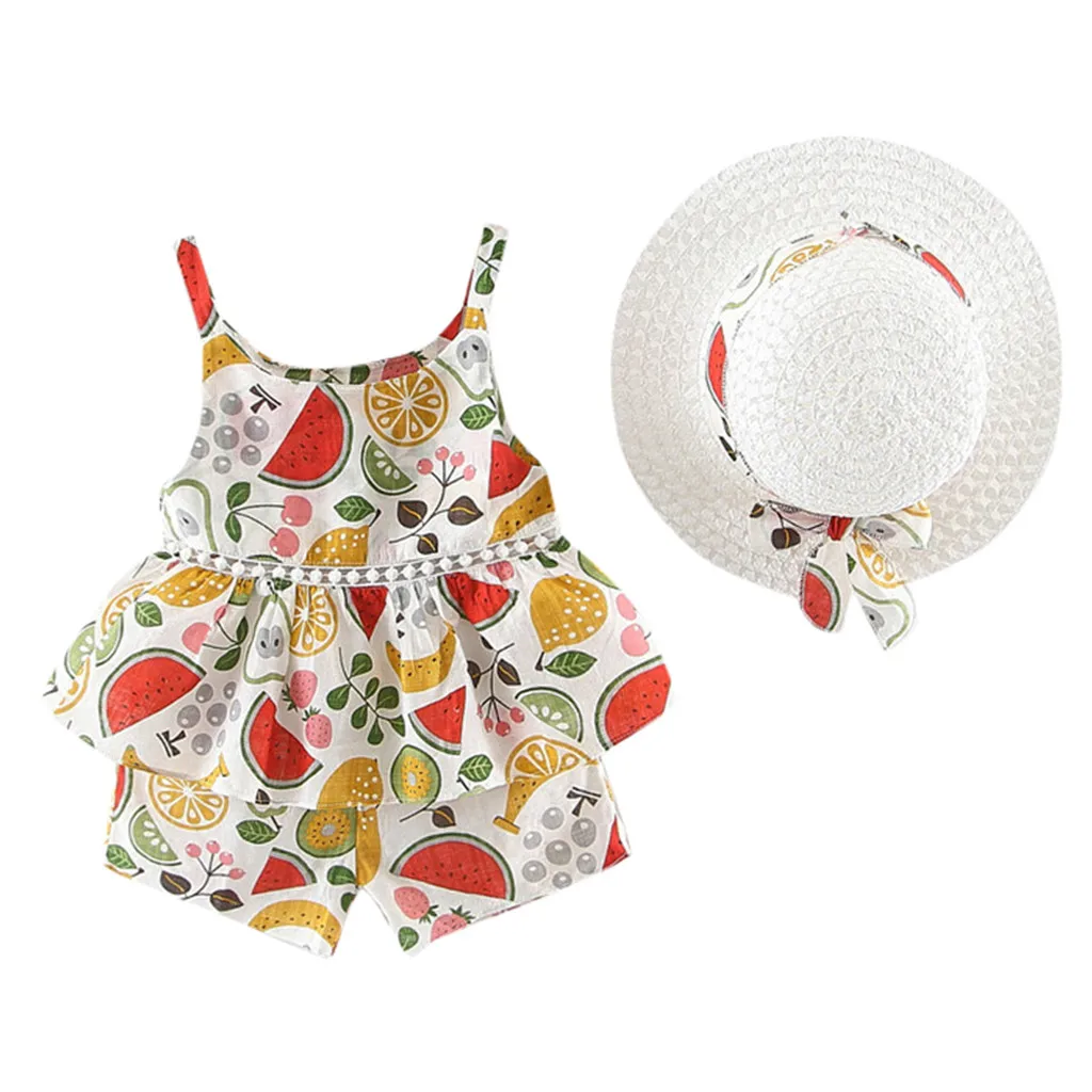 Топы на бретельках с цветочным принтом и фруктами для маленьких девочек, комплекты с шортами, повседневный комплект с шапочкой