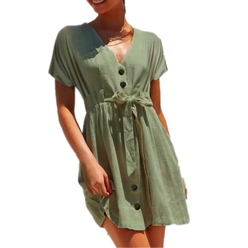 * Описание товара: Лето; Повседневный; Модный; v-образный вырез; короткий рукав; пуговица; мини-платье