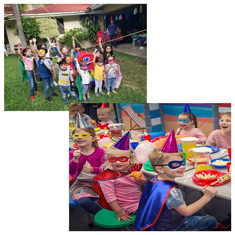 Накидка точно соответствует описанию, примерно 70*70 см, ширина вокруг шеи достаточно широкая, чтобы ребенок мог удобно носить. Маски измеряют приблизительно 20*15 см, подходит для детей 3-7 лет Отличные прочные двухсторонние накидки, легкая застежка-липучка. Потрясающие маски изготовлены из войлочного материала с прочной веревкой Хороший подарок на день рождения, платье и маскарадный костюм. Отличный недорогой продукт для детей. Высококачественная ткань и гуманный дизайн для комфортного и мягкого ношения. Через CPSIA, EN71 мониторинг окружающей среды, Лучшая безопасность, отсутствие вреда для кожи, Защита окружающей среды