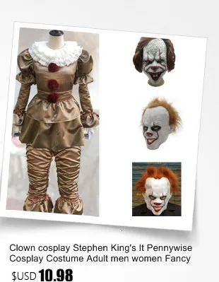 Карнавальный костюм клоуна на Хэллоуин, костюм Стивена Кинга, костюм для косплея, костюм для взрослых мужчин и женщин, мужской костюм на Хэллоуин, костюм клоуна Цвет: как на картинке Включает: топы + брюки Размер: S,M, L, XL, XXL, 3XL Единица измерения: см (1 дюйм = 2,54 см) Примечания: мы измеряем вручную, допускается отклонение в размере от 1 до 4 см.