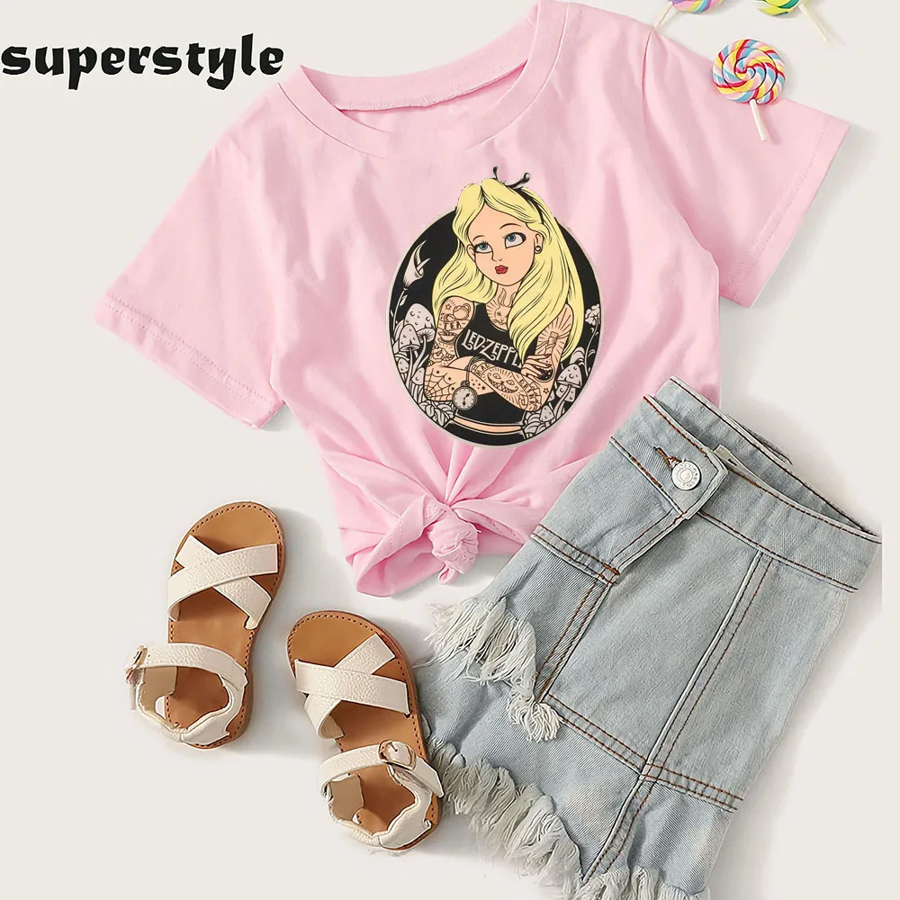 Хлопковые футболки принцессы с короткими рукавами для маленьких девочек с изображением Алисы летние розовые топы для маленьких девочек от 2 до 10 лет, детская одежда dGKT305