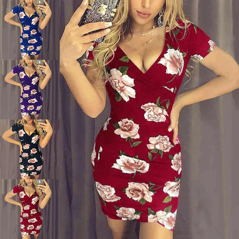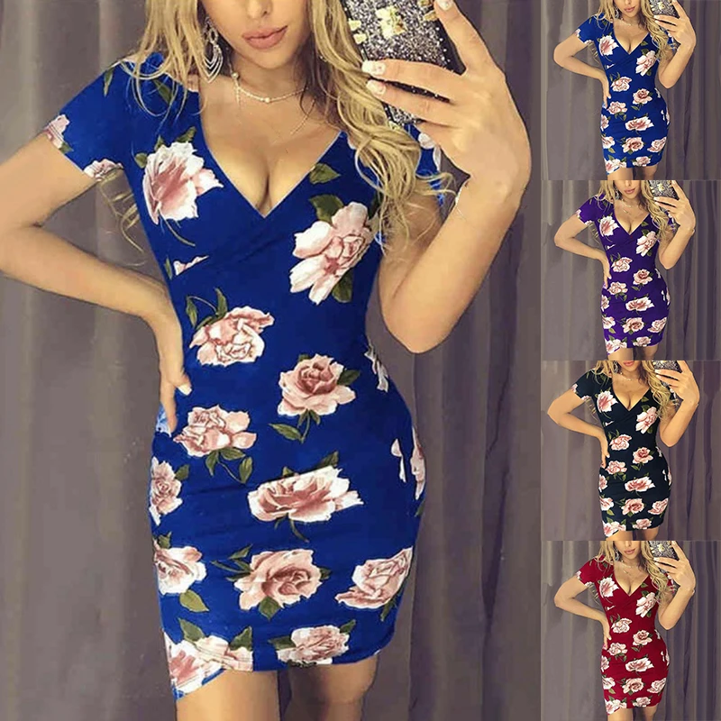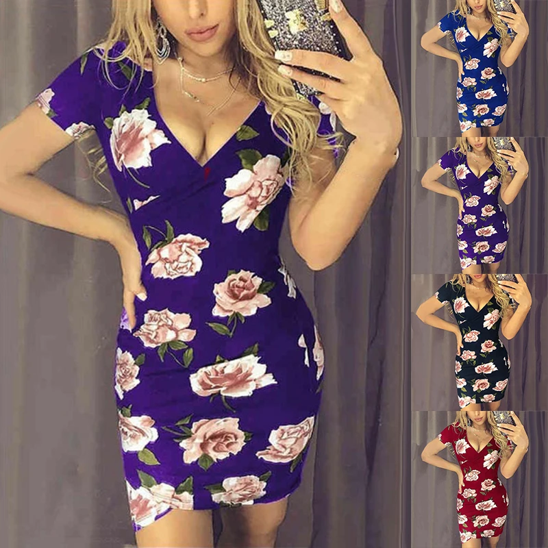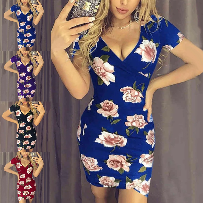 * Описание товара: v-образный вырез; короткий рукав; цветочный принт; облегающий тонкий асимметричный; юбка; мини-платье