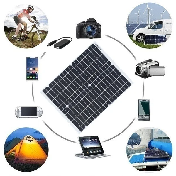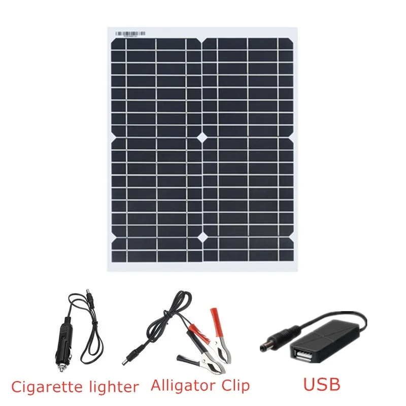 20 Вт солнечная панель: 1*20 Вт солнечная панель 1 * DC + кабель с зажимом типа крокодил 1 * DC + кабель прикуривателя 1 * USB постоянного тока 30 Вт солнечная панель; 1*30 Вт солнечная панель