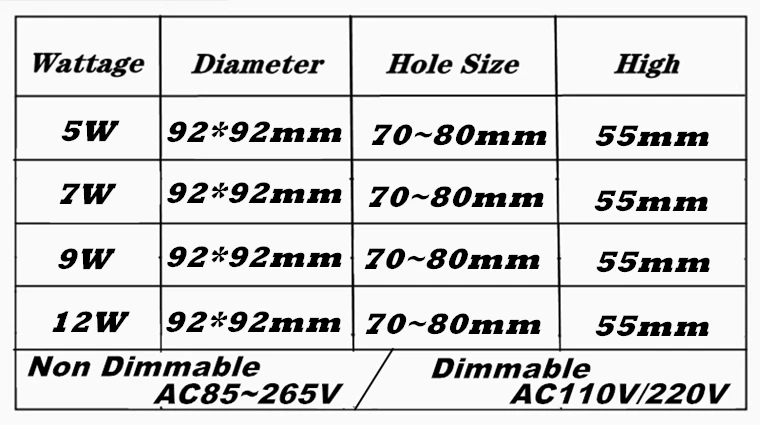 Входное напряжение: AC85-265V/110В/220В 50/60 Гц Мощность: 5 Вт/7 Вт/9 Вт/12 Вт Регулировка яркости: Да CRI:> Ra85 Угол луча: 30 ° Светодиодный чип: C0B чип (Epistar) Световой поток: 95 ~ 110 лм/Вт Температура: от-25 до 45 ° Цветовая температура: теплый белый: (2700 K-3000 K); натуральный белый: (4000 K-4200 K); Холодный белый: (6000 K-6500 K) Срок службы: 50000 ~ 80000 часов Гарантия: 3 года Материал: AL + PC Происхождение: Гуандун (Китай)