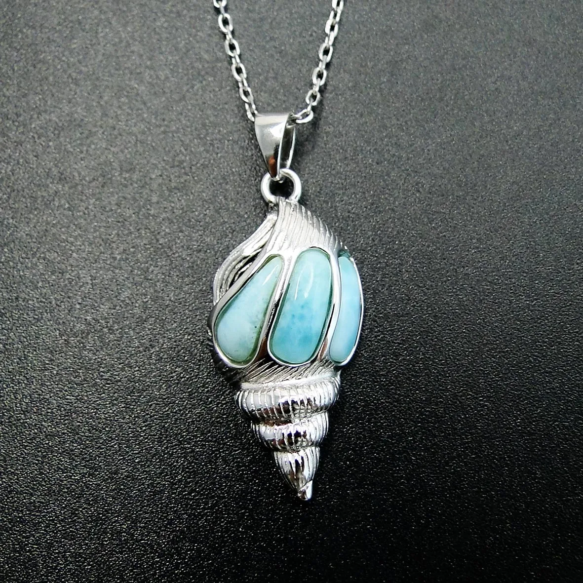 100% 925 Серебряный кулон с натуральным подвеска Larimar натурального камня раковины Шарм Подвеска для Для женщин подарок