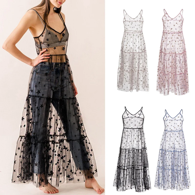 * Описание товара:Тюль, прозрачный, длинный, принт со звездами, ремень для лапши, платье с закрытой спиной