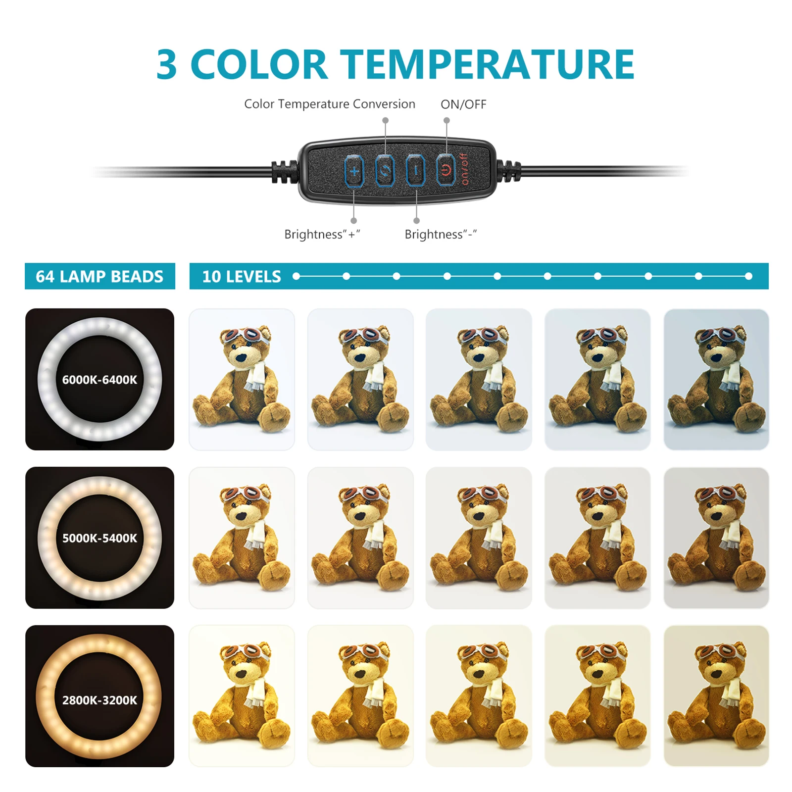 Светодиодное кольцевое освещение с регулируемой яркостью: 4 кольцевых светильника всего 2400лм (64 светодиодных шарика, CRI 85, 6 Вт 100лм/Вт каждый свет) с 3 режимами освещения (2800K-3200K; 5000K-5400K; 6000K-6400K) и регулируемая яркость в каждом режиме, чтобы удовлетворить ваши различные требования к съемке продукта