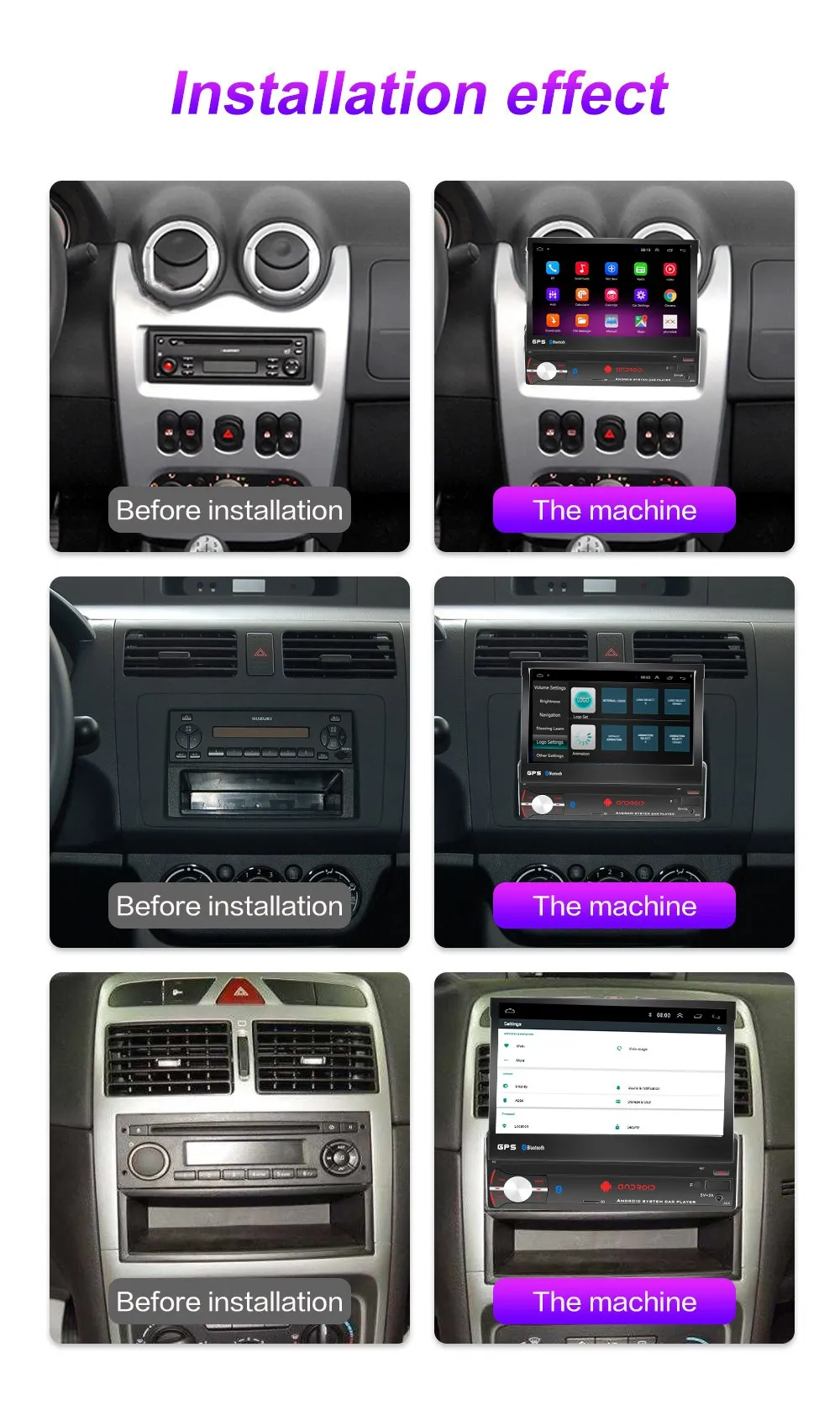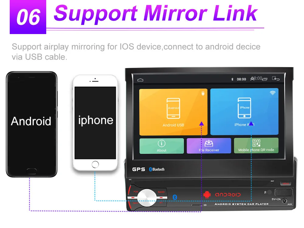 1. Поддержка емкостного сенсорного экрана, мульти-Сенсорная поддержка 2. Встроенный Bluetooth, телефонная книга и A2DP BT Музыка 3. Поддерживает зеркальную связь для телефонов Android и Iphone 4. 7-дюймовый автоматический выдвижной экран 1024*600 5. Передний usb-интерфейс поддерживает только подключение к мобильному телефону Телефоны для зарядки Сзади есть только один usb-порт С яркими огнями Передний слот для карт SD \ TF Стандартная штепсельная вилка ISO, система Android 8,1 Версия WiFi поддерживает видеовыход Версия 4G + WiFi не поддерживает функцию видеовыхода Не поддерживает функцию RDS 6. Поддержка управления рулевым колесом 7. OSD язык более 40 видов: китайский, голландский, индонезийский, малайский, датский, немецкий, английский, испанский, Филиппины, Франция, итальянский, суахили, Литва, Венгрия, Нидерланды, польша, Португалия, Румыния, Словакия, Словения, Турция, Россия, Южная Корея, японский, арабский