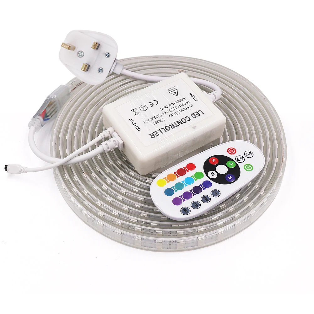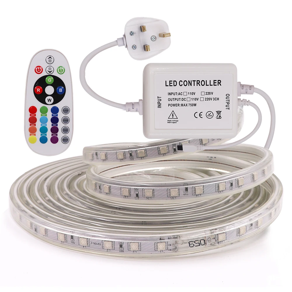 Новое поступление, Светодиодная лента AC220V 5050, гибкая Водонепроницаемая лента, 60 светодиодов/м, 120 светодиодов/м, Домашний Светильник, с контроллером UK 24Key IR RGB