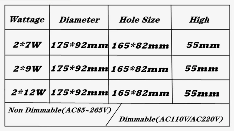 Вход Напряжение: AC85-265V/110V/220V 50/60Hz Мощность: 14 Вт (2*7 Вт)/18 Вт (2*9 Вт)/24 Вт (2*12 Вт) Регулировка яркости: Да CRI:>Ra85 Угол луча: 30 ° Светодиодный чип: C0B (Epistar) Световой поток: 95 ~ 110 лм/Вт Температура: от-25 до 45 ° Цветовая температура: теплый белый:(2700K-3000K); Натуральный белый:(4000K-4200K); Холодный белый:(6000K-6500K) Срок службы: 50000 ~ 80000 часов Гарантия: 3 года Материал: AL + PC Производство: Гуандун (Китай)