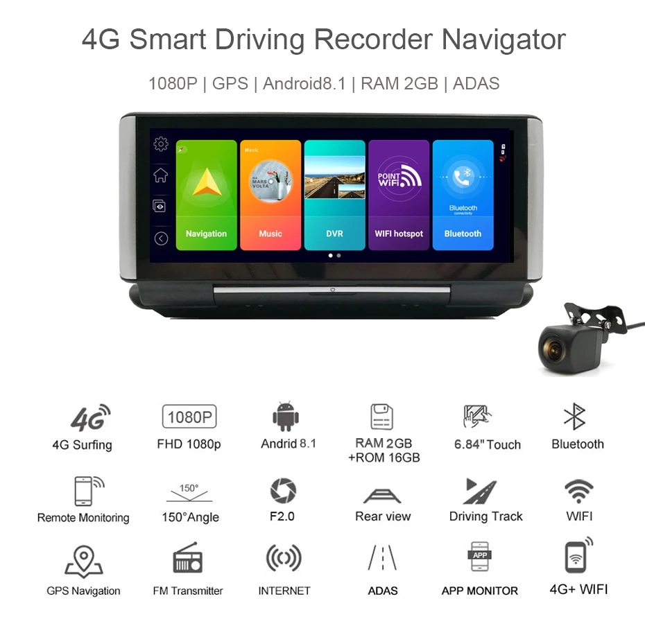 GPS навигация, Автомобильный видеорегистратор, монитор парковки, Bluetooth hands-free, WiFi, fm-передатчик, смарт-устройство с ОС Android 8,1, ADAS,4G интернет-серфинга, удаленный монитор, g-сенсор.