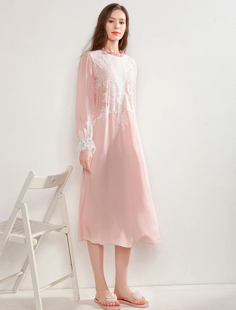 Пижама женская осенняя тонкая розовая хлопковая шелковая роскошная кружевная ночная рубашка с длинными рукавами в стиле ретро D171210