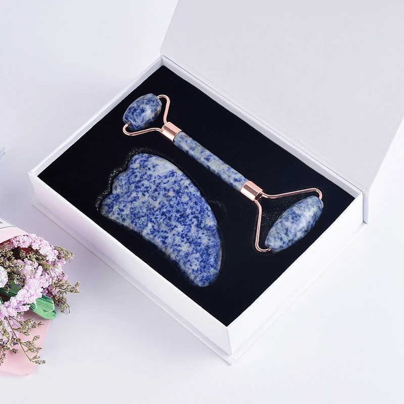 Особенности: Тип: лицевой нефритовый ролик gua sha набор инструментов Материал: 100% натуральный содалит Размеры и вес: Ролик: приложение. 145*55 мм 65 г Gua sha: 80*50 мм 48 г Состояние: новый бренд