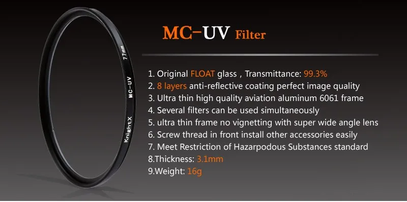 Ультра-тонкие фильтры серии MCUV применяют специальную технологию двустороннего, мульти-покрытия, линзы используют высококачественное Оптическое стекло,