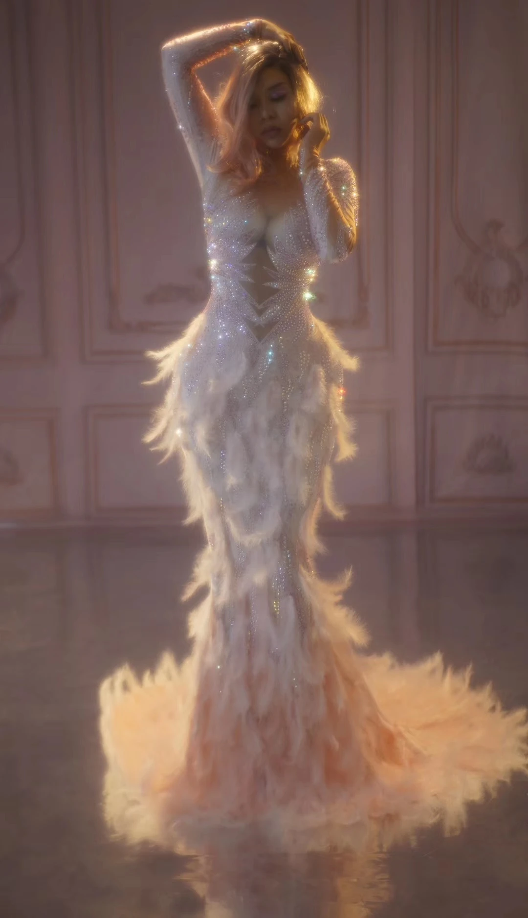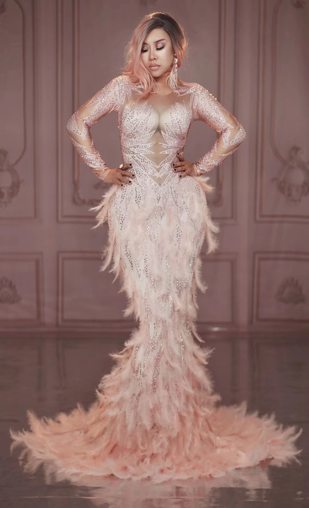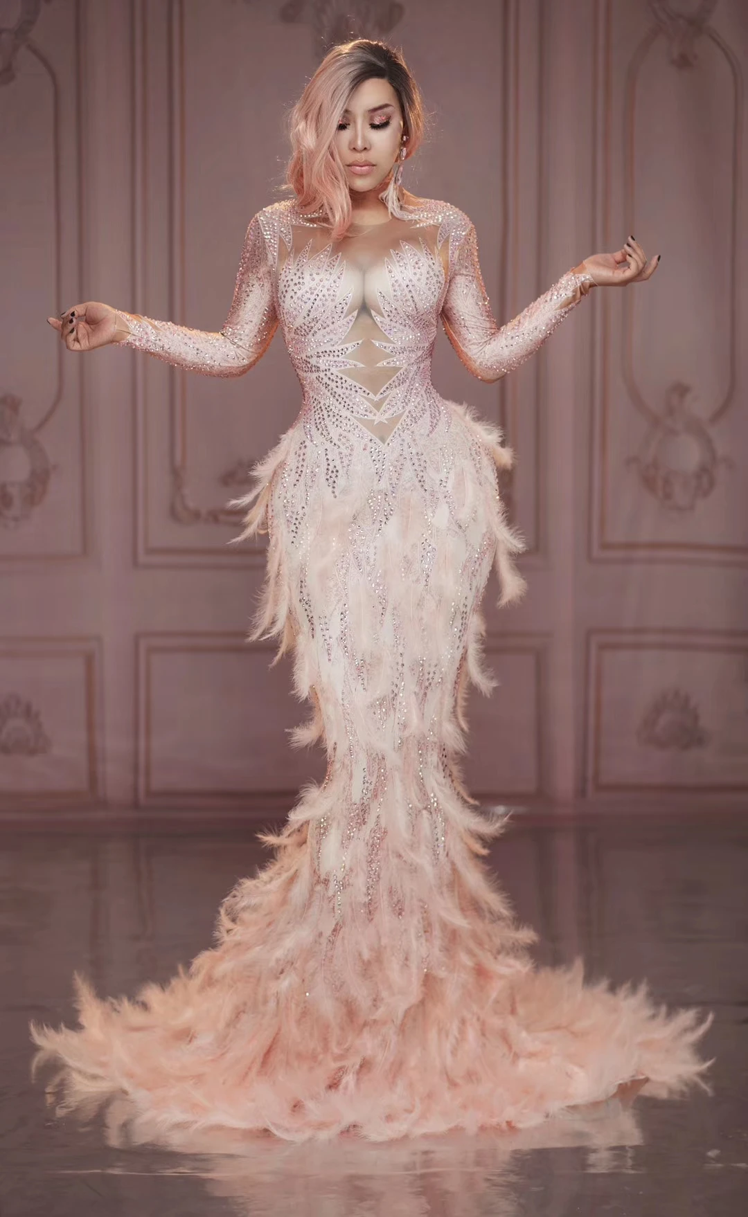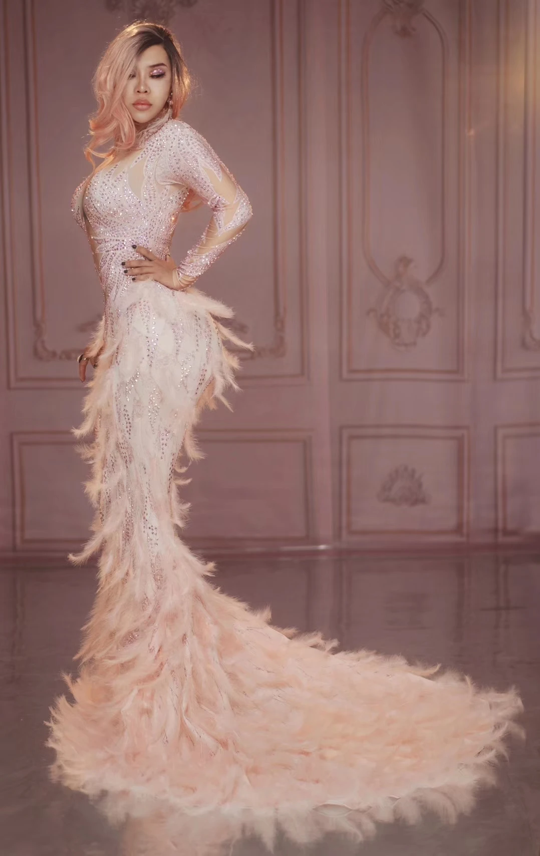 Роскошное длинное платье русалки с розовыми перьями, женские вечерние платья со шлейфом, свадебные стразы, вечернее платье для певицы, наряды для сцены