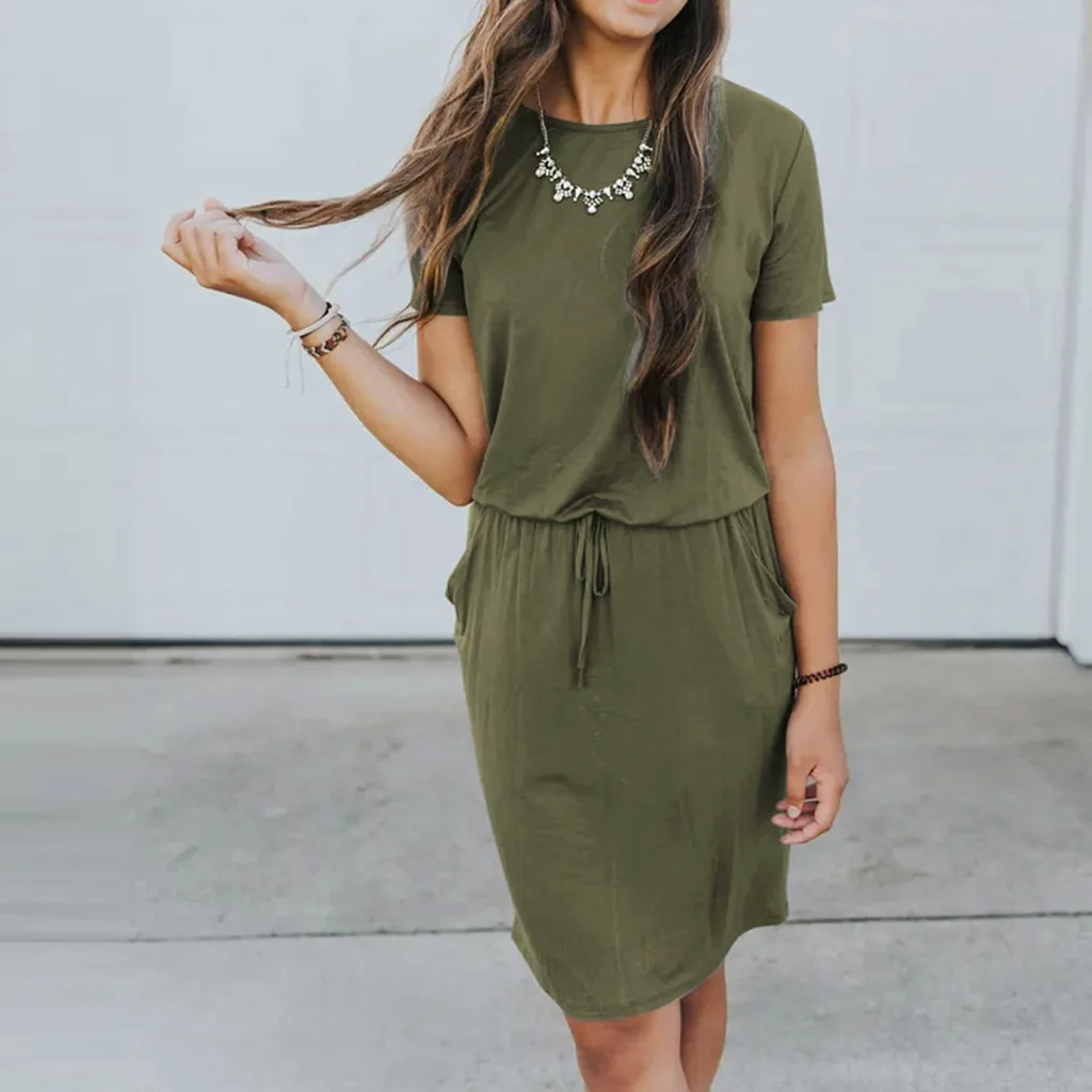 Женское летнее повседневное однотонное платье с карманом и бантом, мини-платье с коротким рукавом