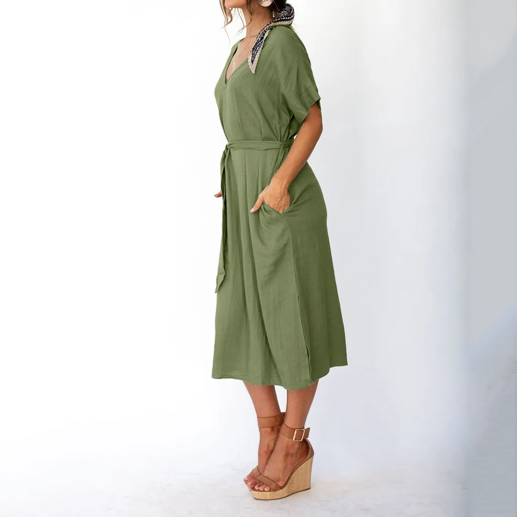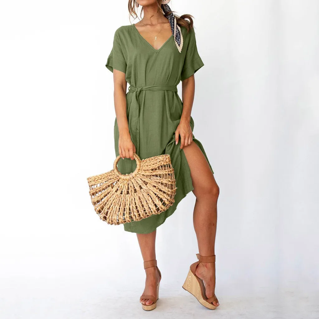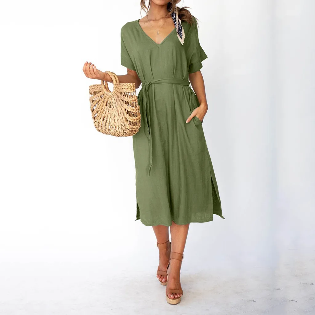Женские повседневные свободные платья OY41 *, летние простые длинные однотонные платья с v-образным вырезом, элегантные вечерние платья с поясом, три цвета