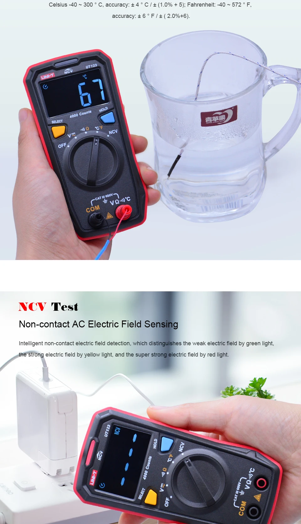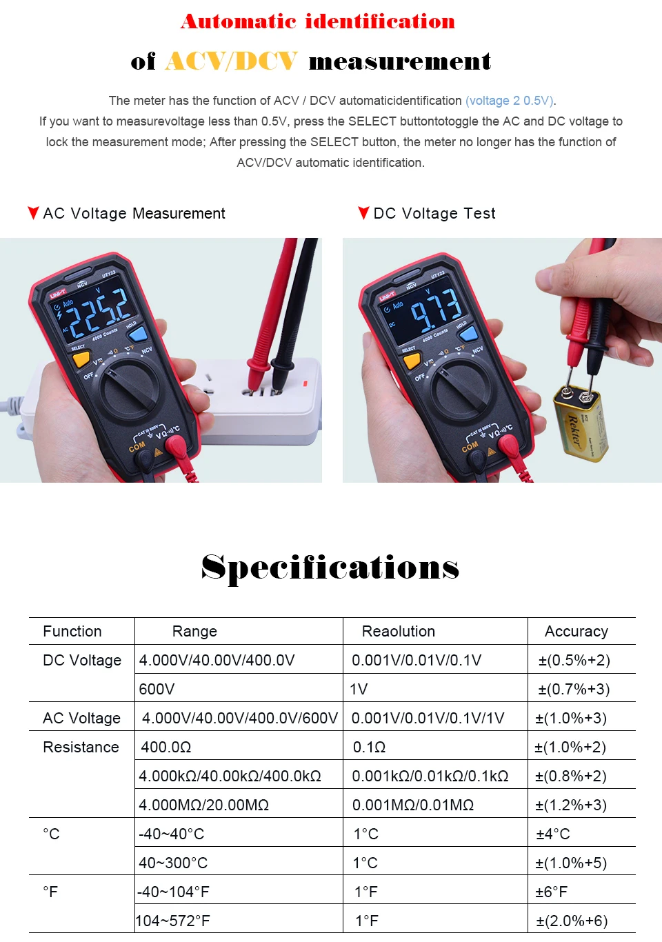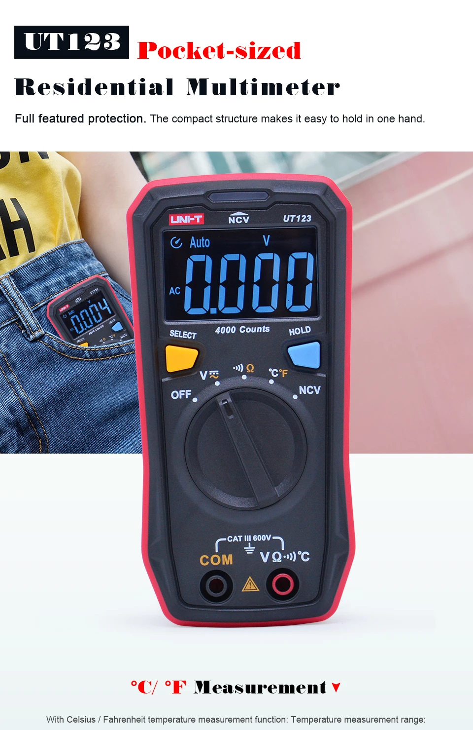 UNI-T UT123 Мини цифровой мультиметр; Измеритель напряжения переменного/постоянного тока; Тестер сопротивления (Ом) температуры; NCV/Проверка целостности цепи/цветной EBTN дисплей