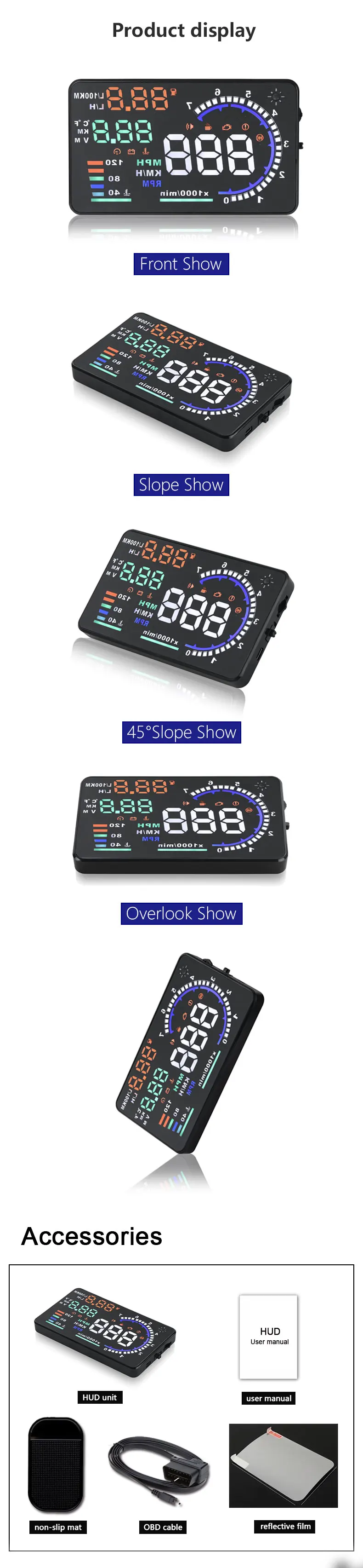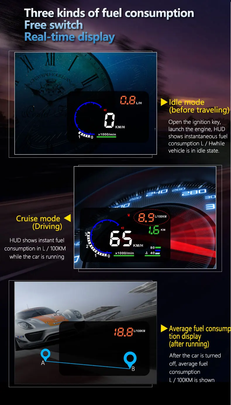 Простота в использовании: просто подключите и играйте, HUD может автоматически адаптироваться к типу транспортного средства, который соответствует OBDII.