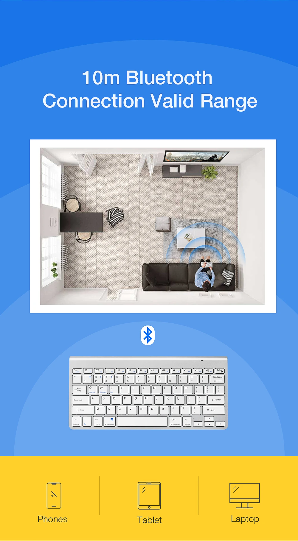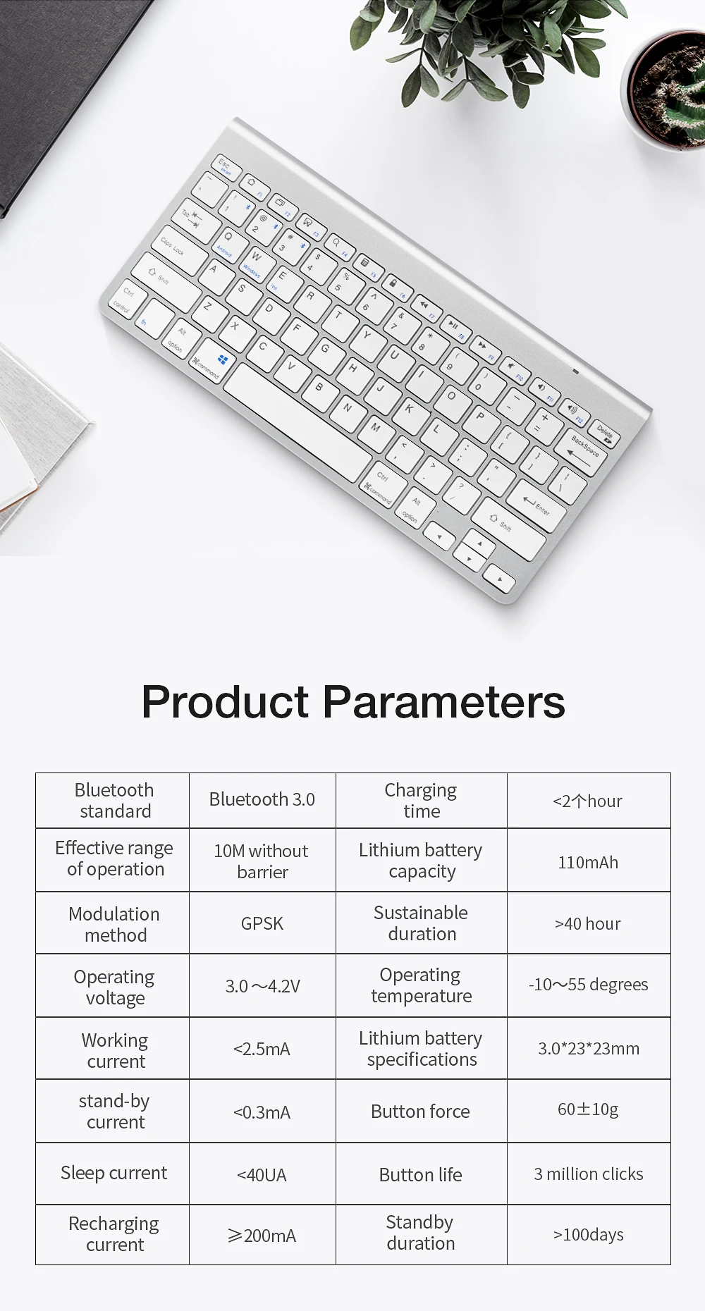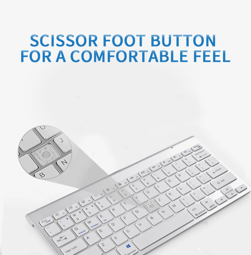 Подключение по BLUETOOTH: технология Bluetooth 3,0 обеспечивает безкабельное и бесконтактное подключение, рабочее расстояние 10 м. Не занимает ни одного usb-порта; Более удобное, стабильное и энергосберегающее Универсальная совместимость: Эта bluetooth-клавиатура работает с устройствами, поддерживающими iOS, Android, Mac и Windows, и другими bluetooth-устройствами, с быстрыми кнопками для всех трех систем. Apple iPad Air, iPad 4 / 3 / 2, iPad Mini 4, iPhone 7 Plus/7/6S/6, Galaxy Tab ,Galaxy Note и другие Работайте дольше с перезаряжаемым аккумулятором: со встроенным литий-ионным аккумулятором Эта перезаряжаемая bluetooth клавиатура поддерживает 60 часов непрерывной работы, 6 месяцев в режиме ожидания после 3 часов полной зарядки Тактильный ввод: Эта bluetooth-клавиатура производит низкий уровень шума, комфортное Сенсорное ощущение с прочной и долговечной конструкцией; Эргономичные ножки и кнопки половинной высоты также помогают предотвратить проблемы с запястьем. Резиновые накладки на спине обеспечивают оптимальный комфорт и безопасность, сохраняя клавиатуру на месте. Довольно кликов, Также избегайте беспокойства о других. Идеально подходит для офиса и семейного использования Простота в использовании, легко носить с собой: быстрое сопряжение. Идеальный размер и легкий корпус, легко помещается в рюкзак, сумку-мессенджер или чехол