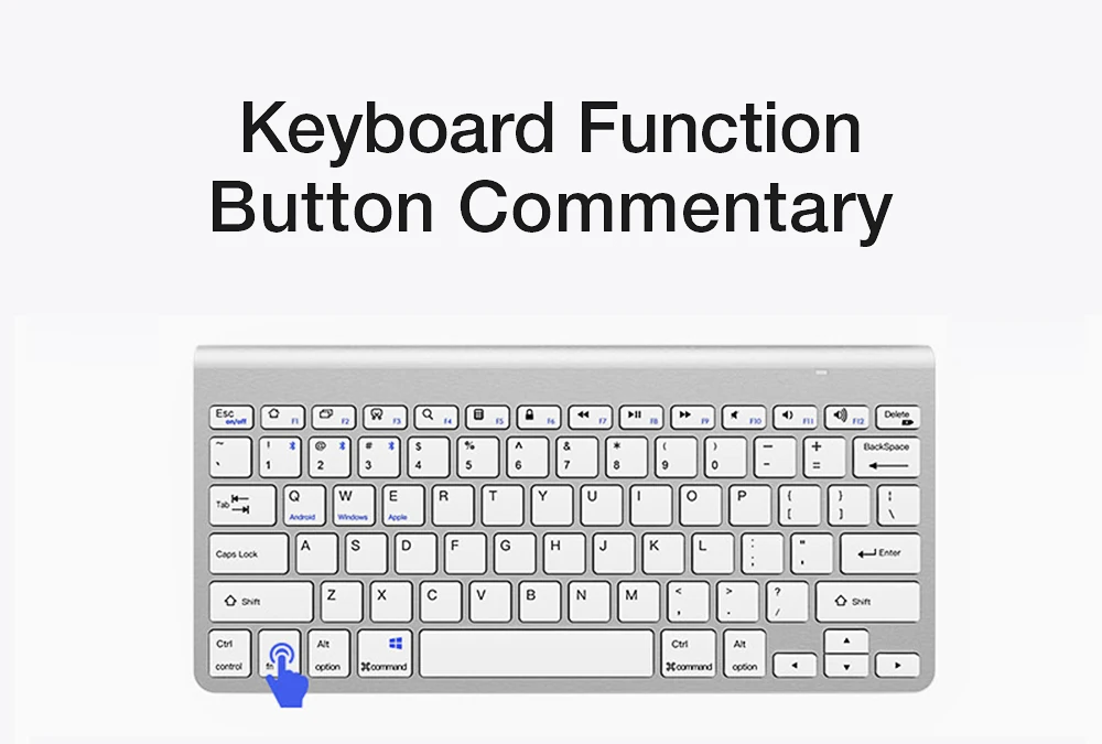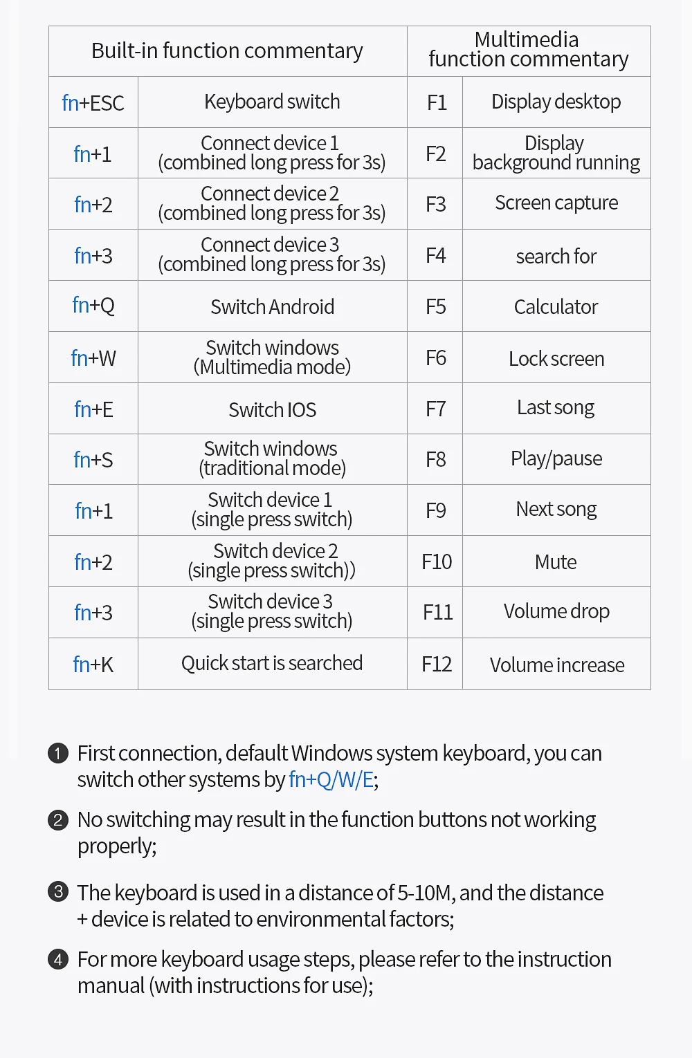 Встроенная функция комментарии Fn + ESC: переключатель клавиатуры Fn + 1: Подключите устройство 1 (комбинированный длинный пресс для 3 сек) Fn + 2: Подключение устройства 2 (комбинированный длинный пресс для 3s) Fn + 3: Подключение устройства 3 (комбинированный длинный пресс для 3s) Fn + Q: переключатель Android Fn + W: переключатель windows (режим мультимедиа) Fn + E: переключатель IOS Fn + S: Переключение windows (традиционный режим) Fn + 1: устройство переключения 1 (однорычажный переключатель) Fn + 2: устройство переключения 2 (однорычажный переключатель) Fn + 3: устройство переключения 3 (однорычажный переключатель) Fn + K: быстрый запуск, поиск Мультимедийными функциональными комментарии F1: дисплей для рабочего стола F2: запуск фона дисплея F3: захват экрана F4: Поиск F5: калькулятор F6: блокировка экрана F7: последняя версия F8: воспроизведение/пауза F9: Next song F10: без звука F11: уменьшение объема F12: увеличение объема 1. Первое подключение, системная клавиатура Windows по умолчанию, вы можете переключаться на другие системы через fn + Q / W / E; 2. Без переключения кнопки функции могут работать неправильно; 3. Клавиатура используется на расстоянии 5-10 м, а расстояние + устройство связано с экологическими факторами; 4. Для получения дополнительных шагов по использованию клавиатуры, пожалуйста, обратитесь к Руководству по эксплуатации (с инструкциями по эксплуатации).