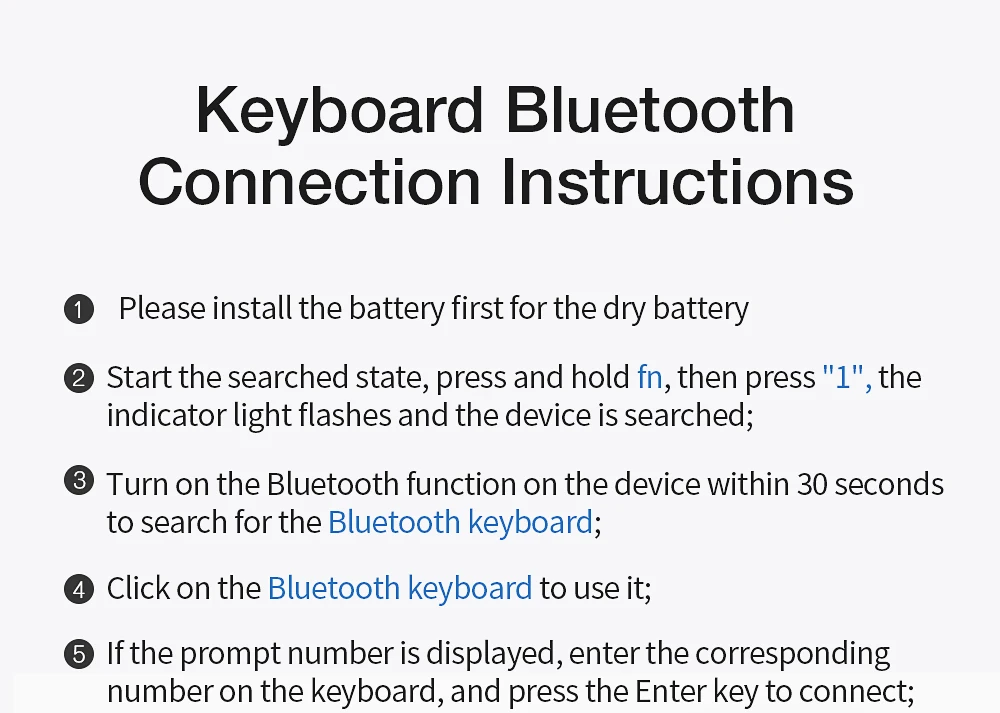 1. Пожалуйста, сначала установите аккумулятор для сухого аккумулятора 2. Арт поиска, нажмите и удерживайте кнопку «fn», затем нажмите «1», индикатор светильник вспышки и устройство поиска; 3. Функция rn на Bluetooth на устройстве в течение 30 секунд для поиска клавиатуры Bluetooth; 4. Нажмите на клавиатуру Bluetooth, чтобы использовать ее; 5. Если отображается номер подсказки, вставьте соответствующий номер на клавиатуре и нажмите кнопку «Ввод» для подключения.