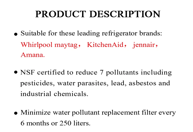 Введите Номер модели для подтверждения пригодности: Фильтр 7-это единственный фильтр, доступный от компании, подходящий для холодильников maytag, KitchenAid, jennair и Amana. Заменить ASIN номер b001onhn02 Сертифицировано NSF для уменьшения 7 загрязняющих веществ, включая пестициды, водные паразиты, свинец, асбест и промышленные химикаты Сертифицировано для ведущих брендов холодильников: maytag и jenn-air JEA. Фильтр однократного применения ukf7003 В холодильнике side-by-side принимайте фильтр для использования. 7. Отсек фильтра для верхнего правого угла холодильника Минимизированный Сменный фильтр для воды каждые 6 месяцев или 250 литров Сертифицировано для ведущих брендов, таких как холодильники: maytag и jenn-air JEA