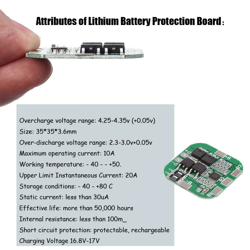 Характеристики: Защита от перезаряда Диапазон напряжения: 4,25-4,35 v ± 0,05 v Защита от избыточной разрядки Диапазон напряжения: 2,3-3,0 v ± 0,05 v Верхний предел рабочего тока: 10A Рабочая температура: -40 --- + 50 °C Верхний предел мгновенного тока: 20A Условия хранения: -40-+ 80 °C Ток покоя: менее 30uA Эффективный срок службы: более 50000 часов Внутреннее сопротивление: менее 100 МОм Защита от короткого замыкания: защита, восстановление заряда Напряжение зарядки 16,8-17 в