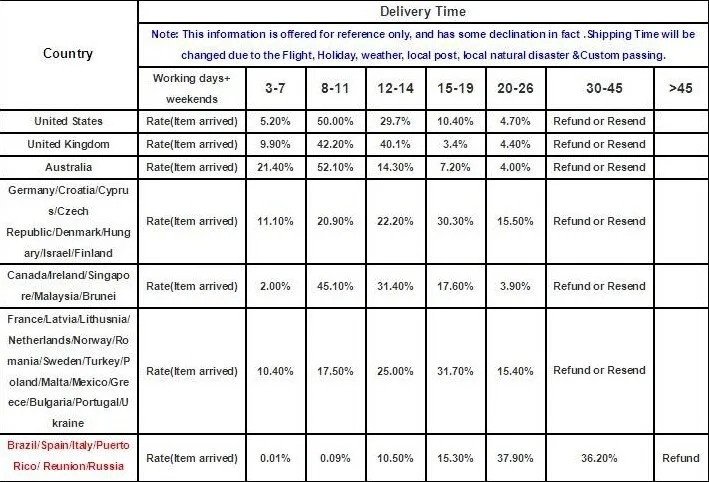 Доставка 1. Товары отправляются из Китая авиапочтой, доставляются в большинство стран в течение 15-30 рабочих дней. 2. Товар отправляется в течение 5 рабочих дней после полной оплаты. 3. Покупатель должен оплатить любые таможенные и таможенные сборы при импорте товаров. Время обслуживания Мы ответим на вашу почту в течение 24 часов Обычно. Иногда случается небольшая задержка из-за выходных или праздников. Если вы не можете получить нашу почту через 48 часов, пожалуйста, проверьте свой спам или свяжитесь с нами по другому адресу электронной почты.