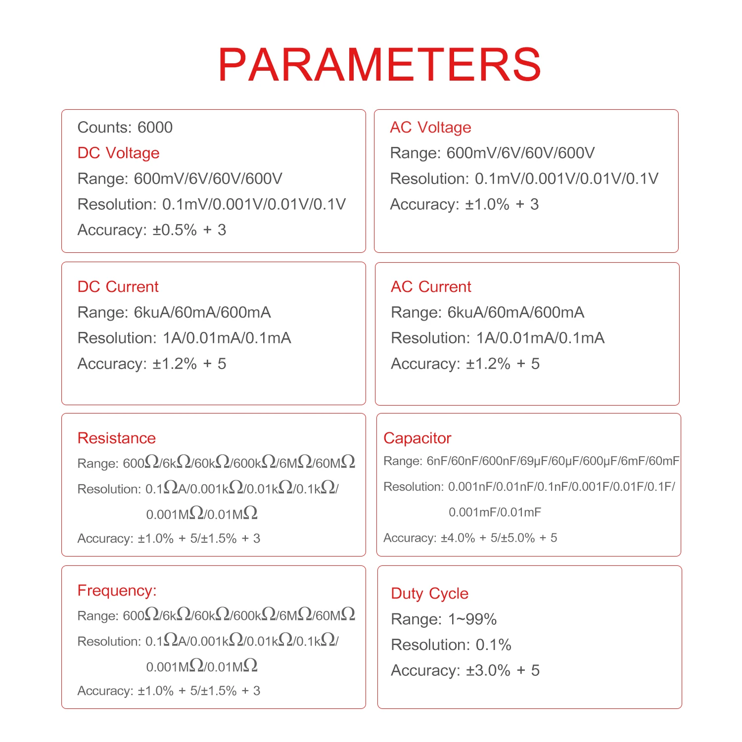 Диапазон емкости: 6nF/60nF/600nF/69 мкФ/60 мкФ/600 мкФ/6mF/60mF