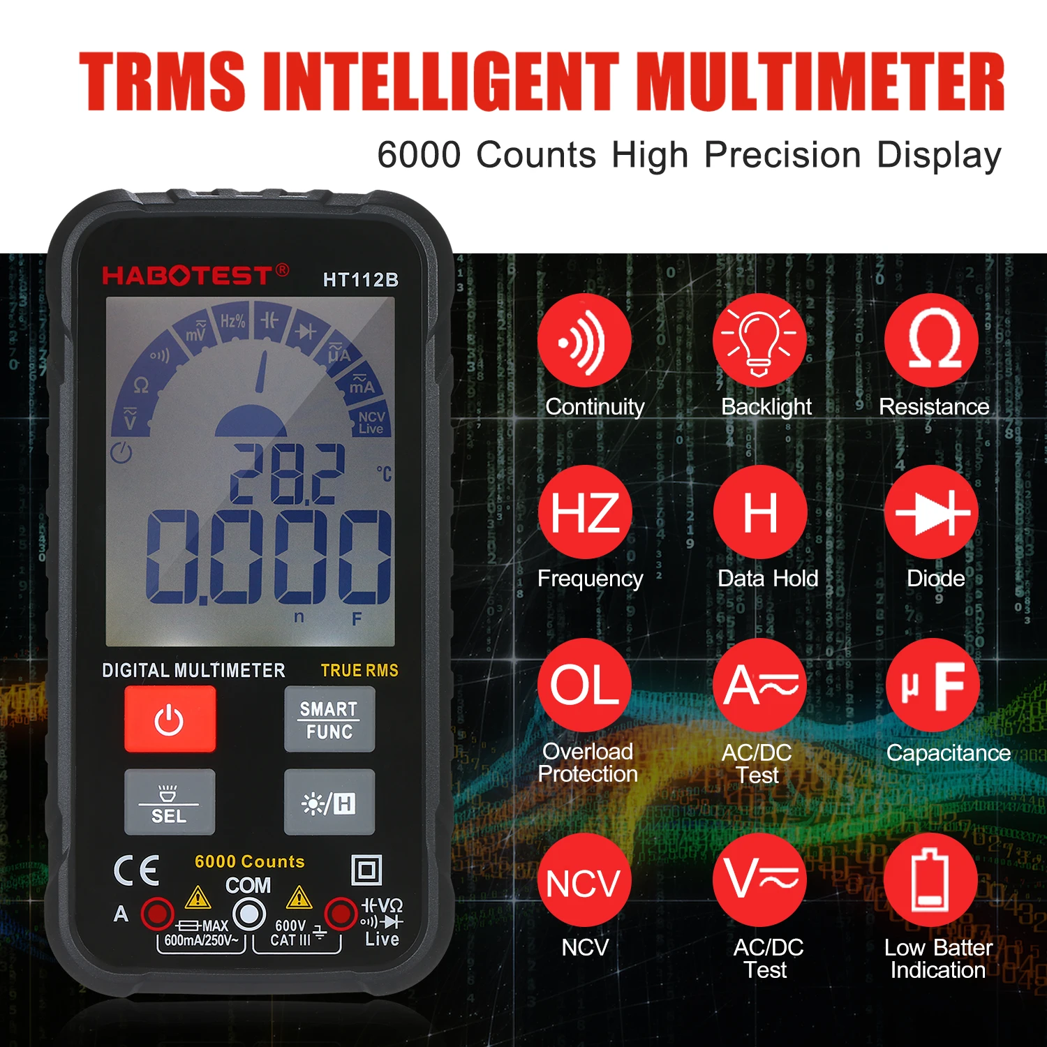 Широкий диапазон испытаний-этот цифровой мультиметр может использоваться для измерения напряжения переменного/постоянного тока, переменного/постоянного тока, сопротивления, непрерывности, емкости, тест s диоды Транзисторы, NCV Live Line.
