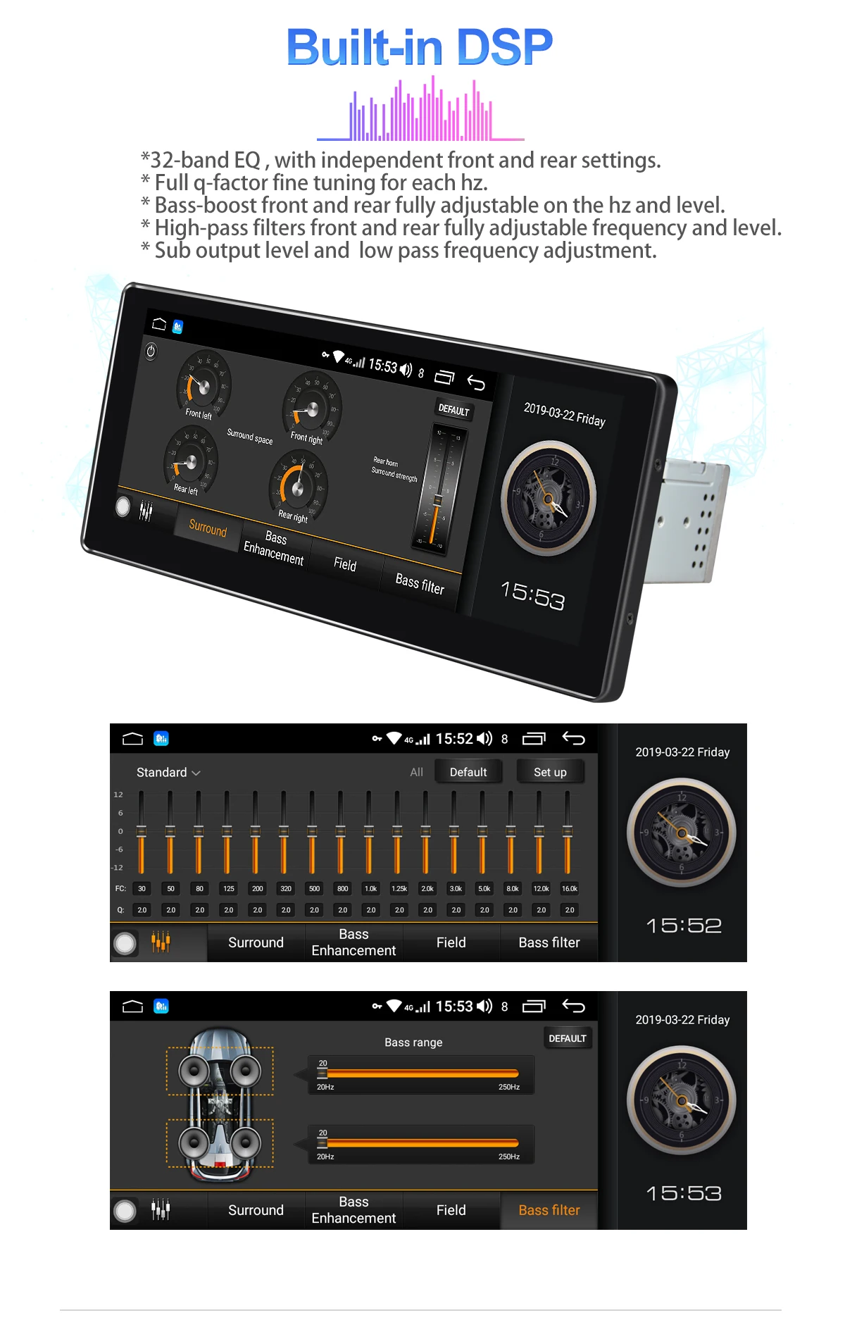 1. Android 8.1.0, Intel 1,8 GHZ Восьмиядерный SC9853I, 10,25 дюймов один din 1280*480 IPS экран 2. Супер аппаратная производительность, 4 Гб RAM + 64 ГБ ROM Octa Core 3. Интернет-развлечения, встроенный модуль 4G и поддержка WiFi 4. Поддержка Google Play Store, вы можете скачать множество приложений 5. Поддержка обратной камеры aftermarket/DVR/OBD2/DAB +/TPMS, вам нужно купить отдельно 6. Поддержка быстрой загрузки, быстрое включение радио 7. Поддержка кнопок управления рулевым колесом (если у вашего автомобиля нет декодера Canbus, если у вашего автомобиля есть декодер Canbus, вам нужно купить дополнительный адаптер с декодером Canbus, чтобы он работал) 8. Bluetooth для handfree, Синхронизация Bluetooth телефонной книги 9. Поддержка сети 3G/4G, делает радио доступ в Интернет легко 10. Встроенный DSP, делает радио лучше звук и более Регулируемый эквалайзер 11. Поддержка Android auto, поддержка проводного подключения (через usb кабель) 12. Поддержка Apple carplay, поддержка беспроводного подключения (через bluetooth) и проводного подключения (через usb кабель) 13. Поддержка голосовой команды Новый JOYING блок теперь поставляется с SPDIF цифровой аудиовыход. Для максимального качества звука вы можете напрямую подключить внешний усилитель/DSP к цифровому выходу SPDIF; Если ваш внешний усилитель/DSP не поставляется с входом SPDIF, вам нужно будет подключить усилитель/DSP через FL/FR out & RL/RR out.