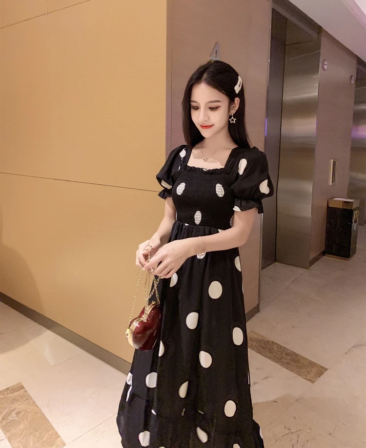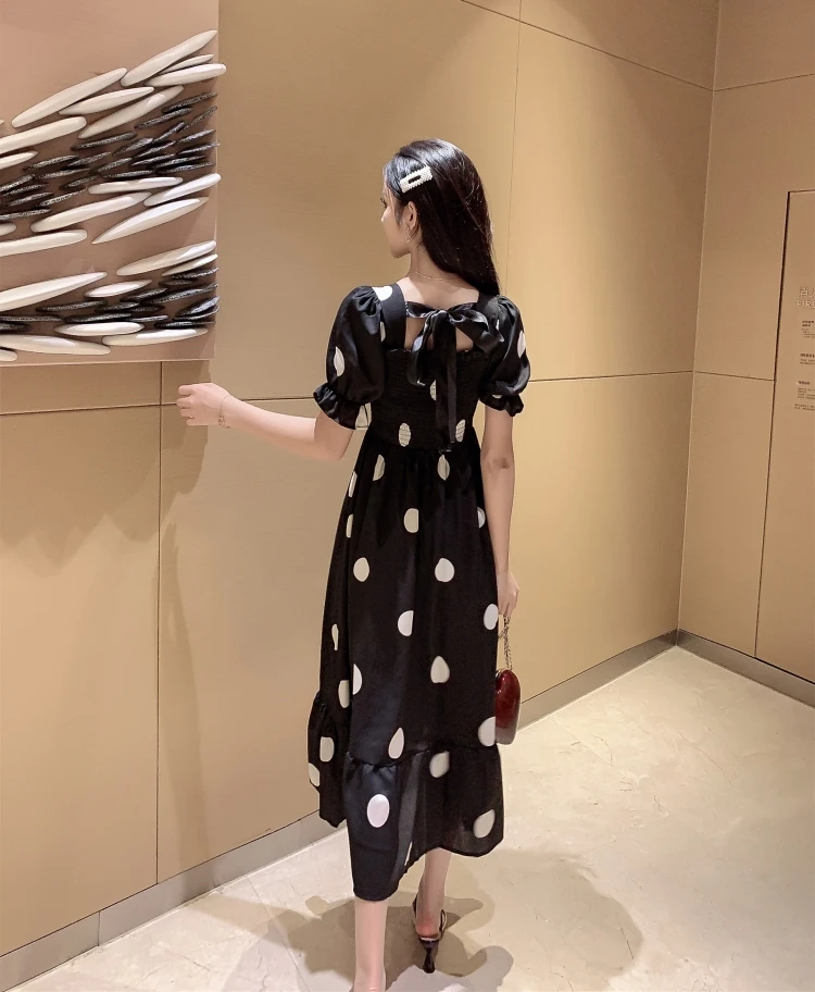 Трапециевидные летние платья для женщин, милая праздничная одежда в Корейском стиле с бантом, платье в черный и белый горошек без бретелек