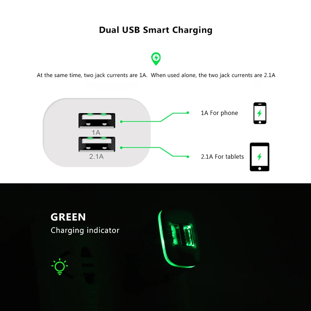 Sindvor 2.1A/1.0A настенное зарядное устройство с двумя портами, зарядное устройство для путешествий, мини USB, светодиодный свет, быстрая зарядка, адаптер питания для iPhone, Android, телефона