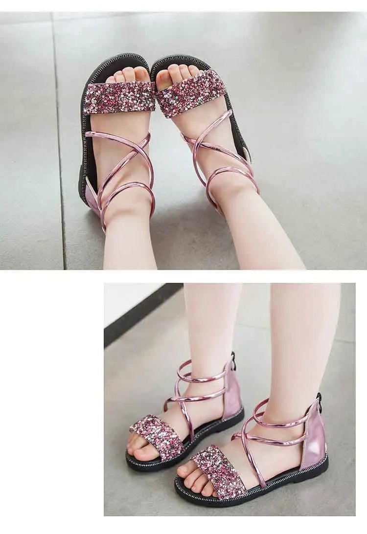 Летние детские сандалии с блестками для девочек подростков 5 6 7 8 9 10 11 12 лет обувь